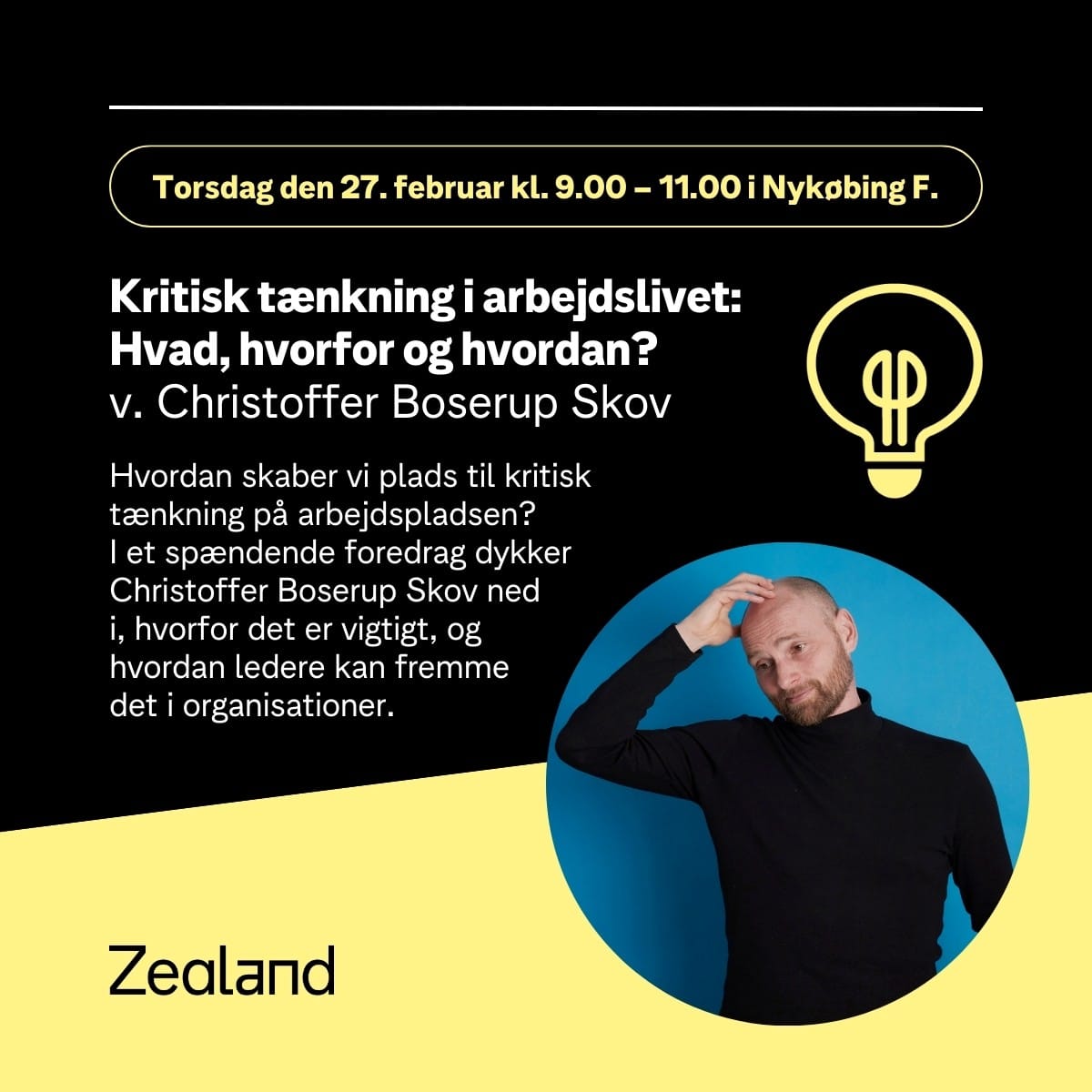 Det kræver organisationer, der kan skabe rum og stimulere til refleksion. I dette foredrag sætter Christoffer Boserup Skov fokus på, hvad kritisk tænkning i det hele taget er, hvorfor det er vigtigt i arbejdslivet, og hvordan du som leder skaber gode rammer for kritisk tænkning på din arbejdsplads. Christoffer Boserup Skov er cand. mag i filosofi og psykologi samt master i retorik. Han er leder af Dansk Talentakademi og forfatter til en række bøger, blandt andet ”Kritisk tænkning i organisation og ledelse”, ”Kritisk Tænkning”, ”Meningen med livet” og ”Basal Videnskabsteori”.