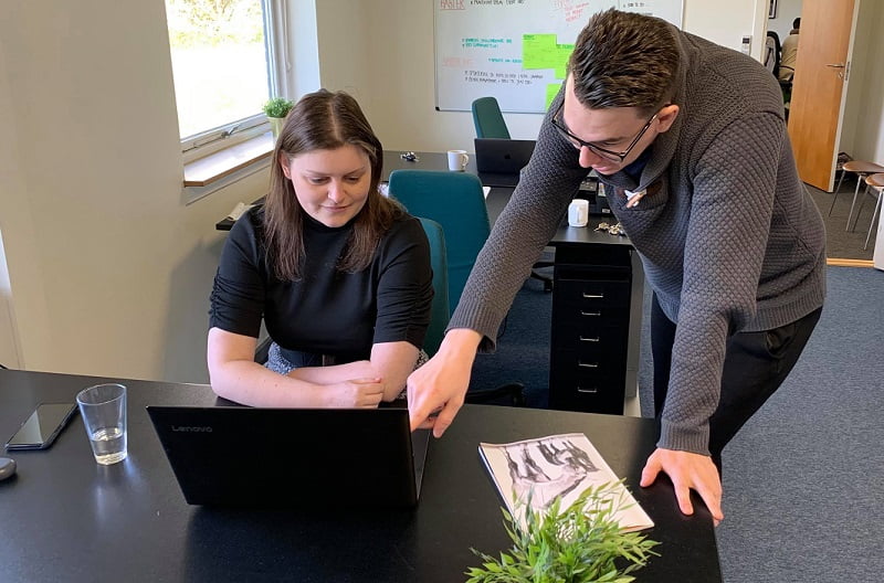 Foto: Anna og salgskonsulent Mark Hansen taler SEO på kontoret.