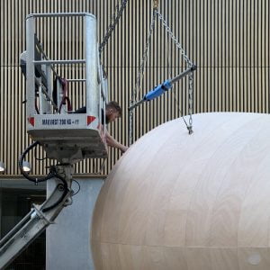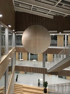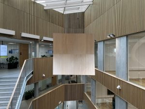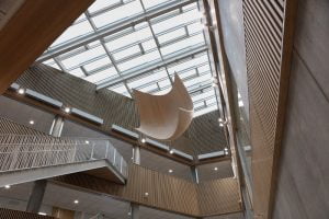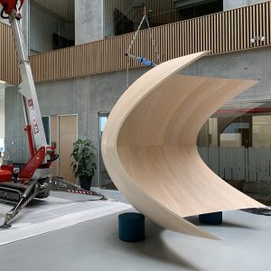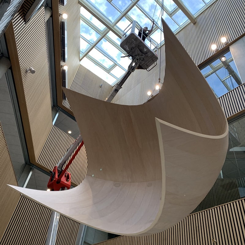 En svævende og fascinerende skulptur i atriummet, som spiller øjet et puds, mens man bevæger dig rundt om den. Formen ændrer sig, alt efter om man iagttager oppefra, nedefra eller fra siden.